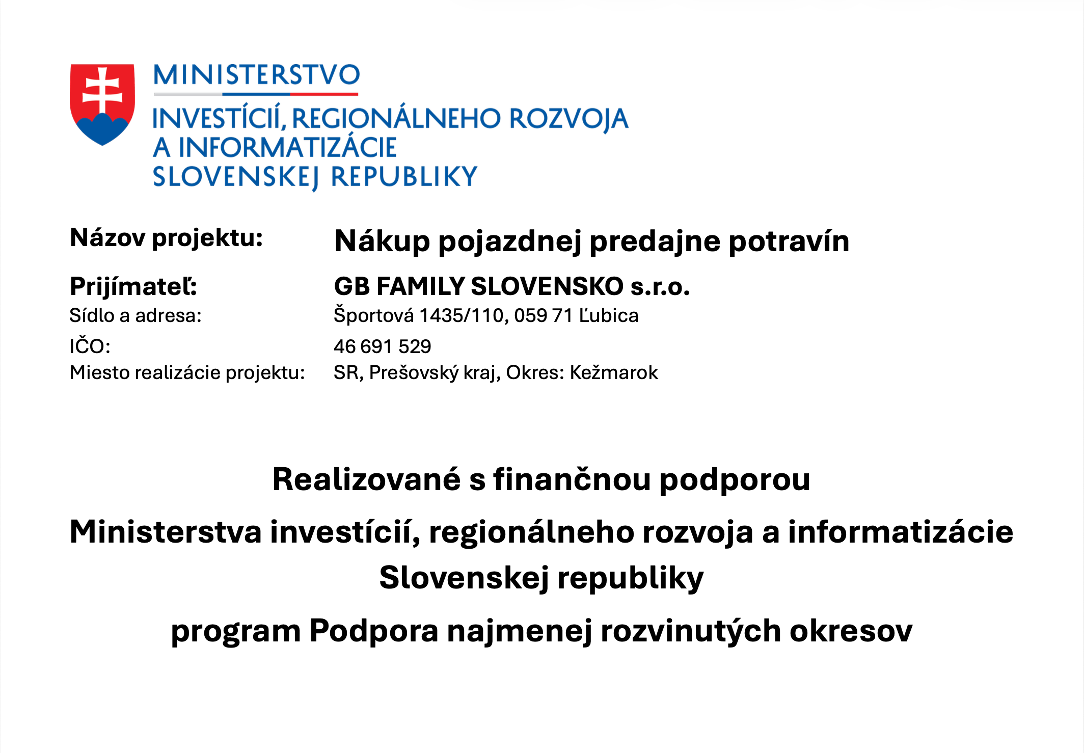 Hlavným cieľom projektu Zvýšenie konkurencieschopnosti spoločnosti GB FAMILY SLOVENSKO s.r.o. je modernizácia výrobného procesu, vytvorenie možnosti spolupráce s vybranou strednou odbornou školou a rozšírenie sortimentu spoločnosti pri výrobe pekárskych a cukrárenských výrobkov ako napr. chlieb, pečivo, smažené pirôžky, kapustníky, trené koláče a ostatné slané a sladké výrobky. Žiadateľ, GB FAMILY SLOVENSKO s.r.o. je rodinná pekáreň ktorá využíva tradičné staroslovanské receptúry a čerstvé suroviny. Hlavnými odberateľmi spoločnosti sú obchody potravín v okrese, zákazníci pojazdných pekárničiek a vlastnej kamennej predajne. Predmetom projektu je obstaranie inovatívnych technológií, na základe ktorých spoločnosť zvýšila efektivitu, zlepšila kvalitu výrobkov a poskytne ekologickejší proces výroby. Tieto inovácie sa uskutočnili kúpou a inštaláciou nasledujúcich technológií: